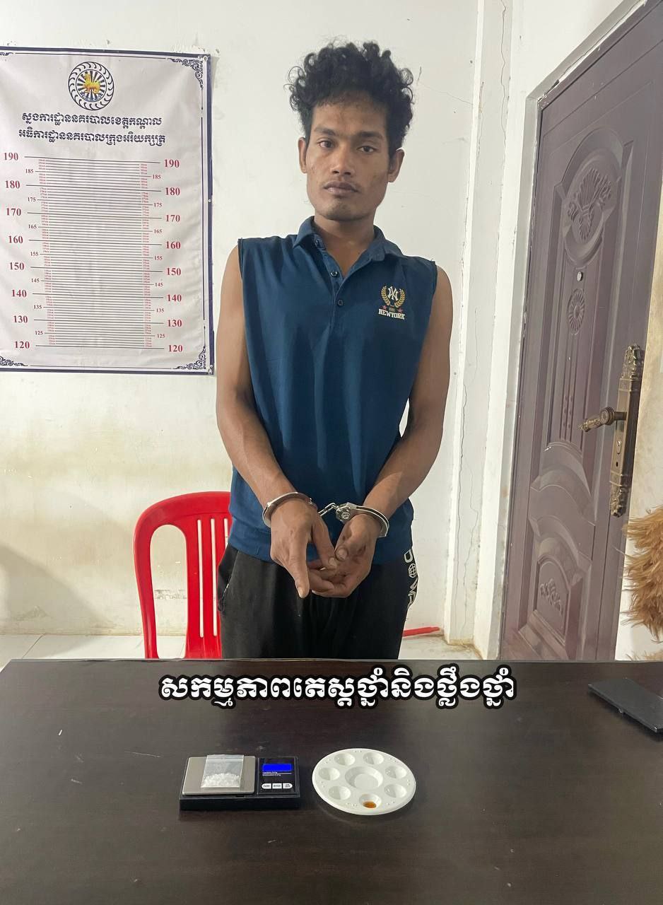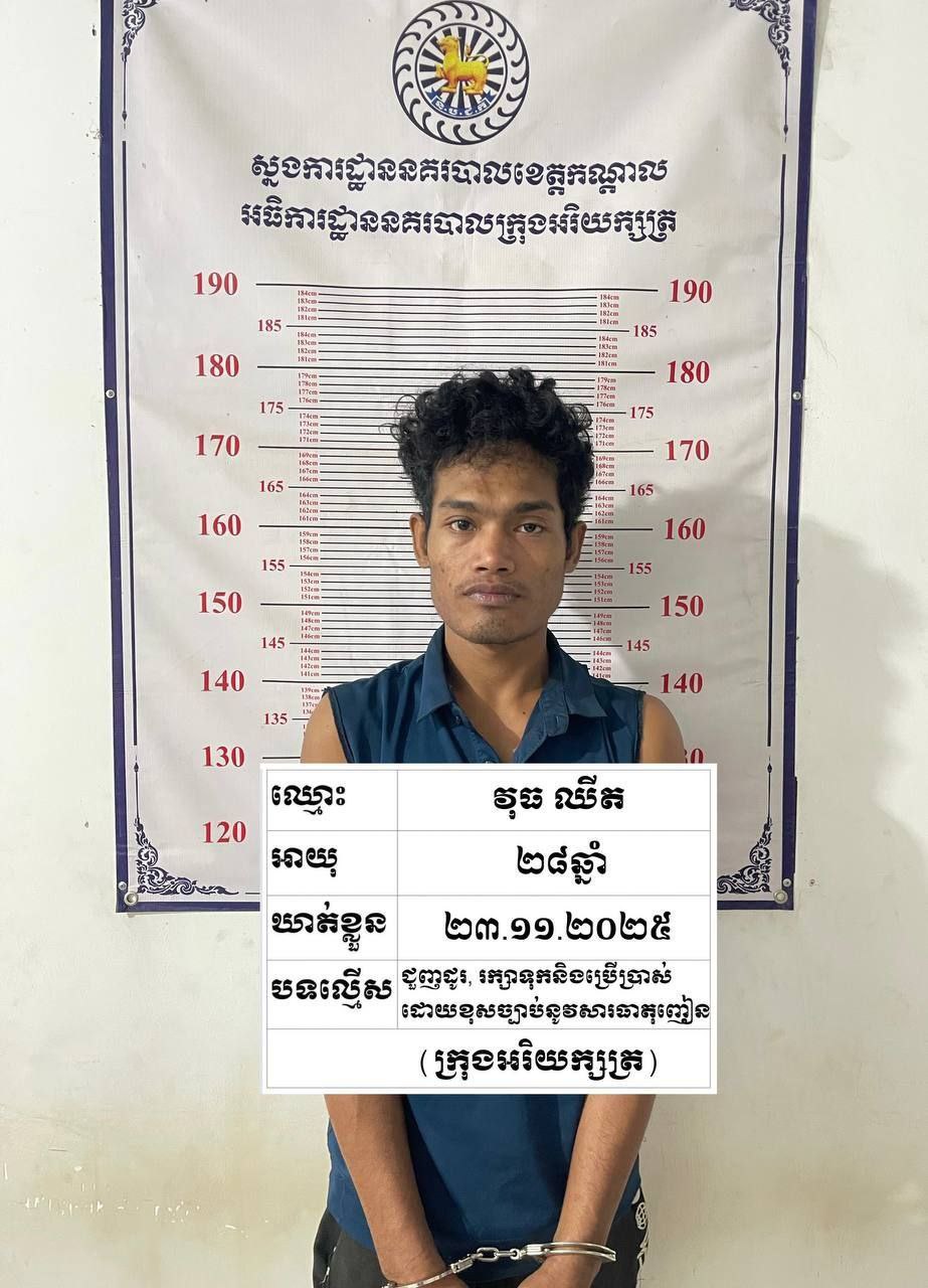 កណ្តាល ÷ជនសង្ស័យម្នាក់ដែលជាមុខសញ្ញាជួញដូរ រក្សាទុកប្រើប្រាស់ត្រូវសមត្ថកិច្ចឃាត់ខ្លួនបានហើយជាមួយវត្ថុតាងគ្រឿងញៀន ចំនួន១២កញ្ចប់ កាលពីវេលាម៉ោង១៧និង០០នាទីថ្ងៃទី២៣ខែវិច្ឆិកាឆ្នាំ២០២៥ នៅចំណុចផ្ទះខ្ទមរបស់ជនសង្ស័យ