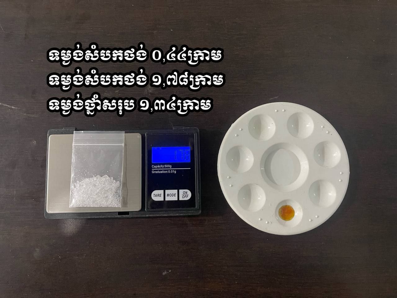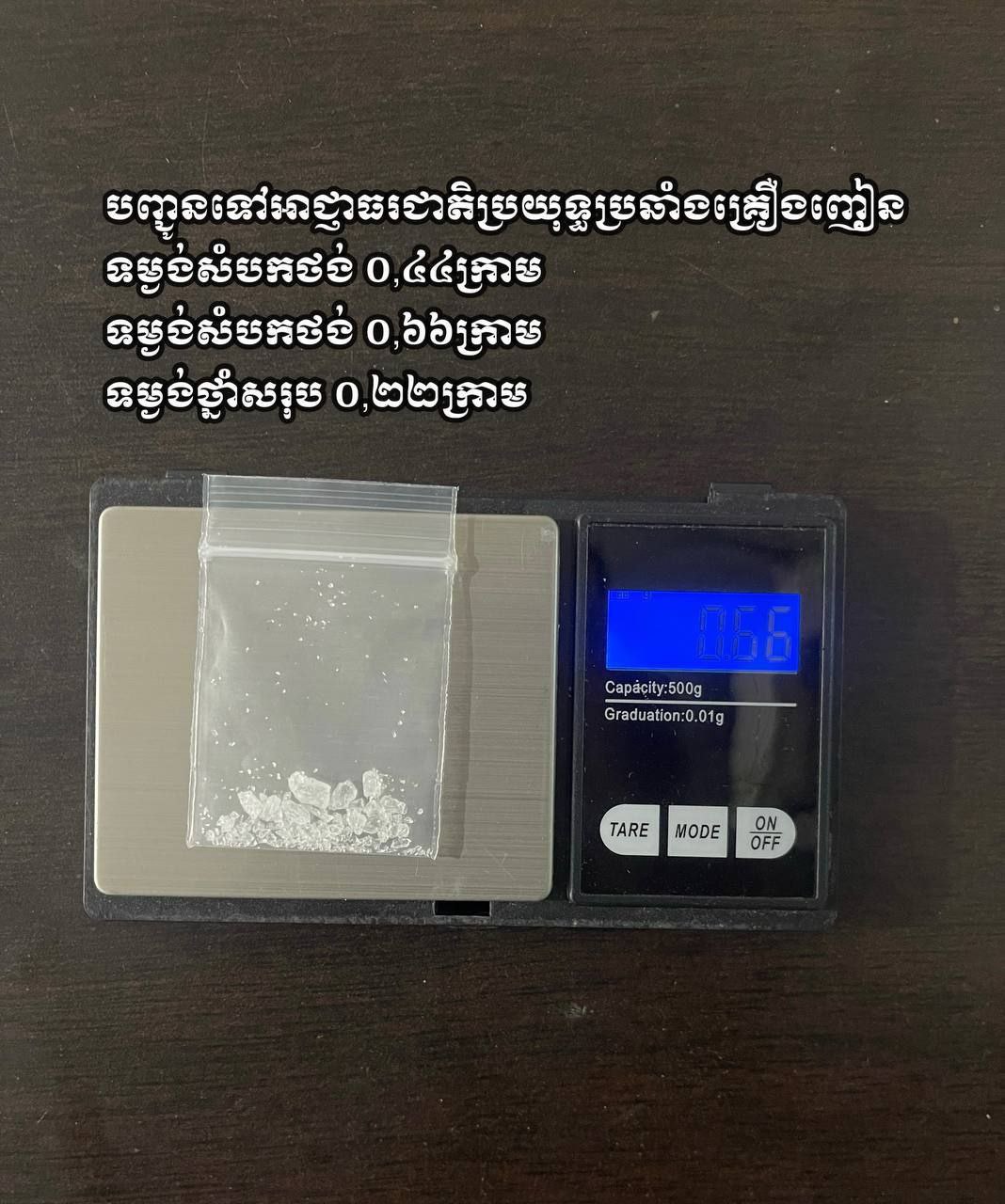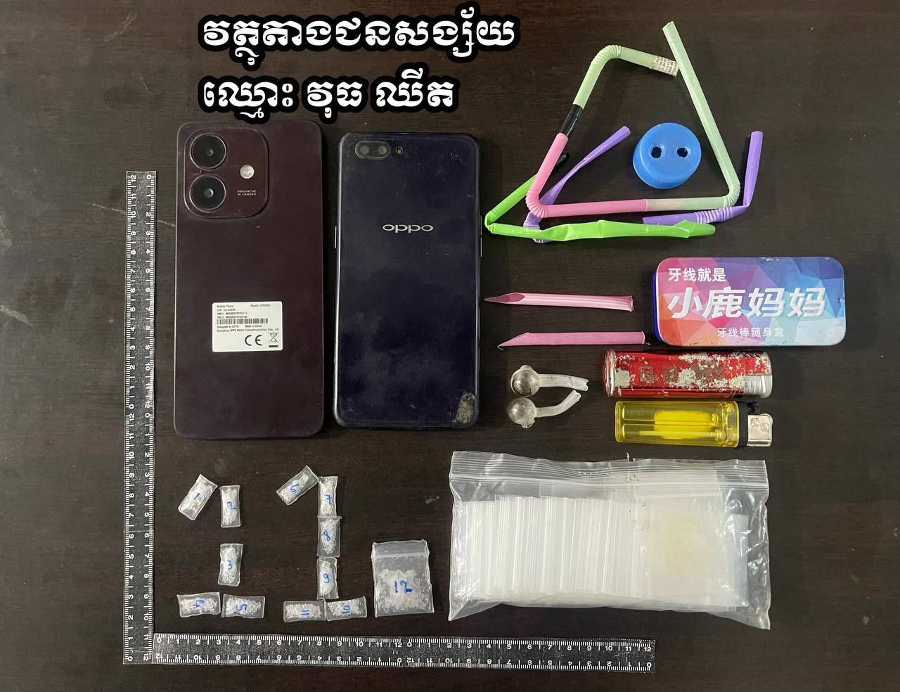 វត្ថុតាងចាប់យក៖ ថ្នាំញៀនប្រភេទ មេតំហ្វេតាមីនសរុប ចំនួន១២ កញ្ចប់ (តូច១១កញ្ចប់ និងមធ្យម ០១កញ្ចប់)ទំងន់សរុប= ១,៣៤ ក្រាម , ទូរសព្ទចំនួន០២គ្រឿង, និងសម្ភារ:វេចខ្ចប់ថ្នាំញៀនមួយចំនួន ។